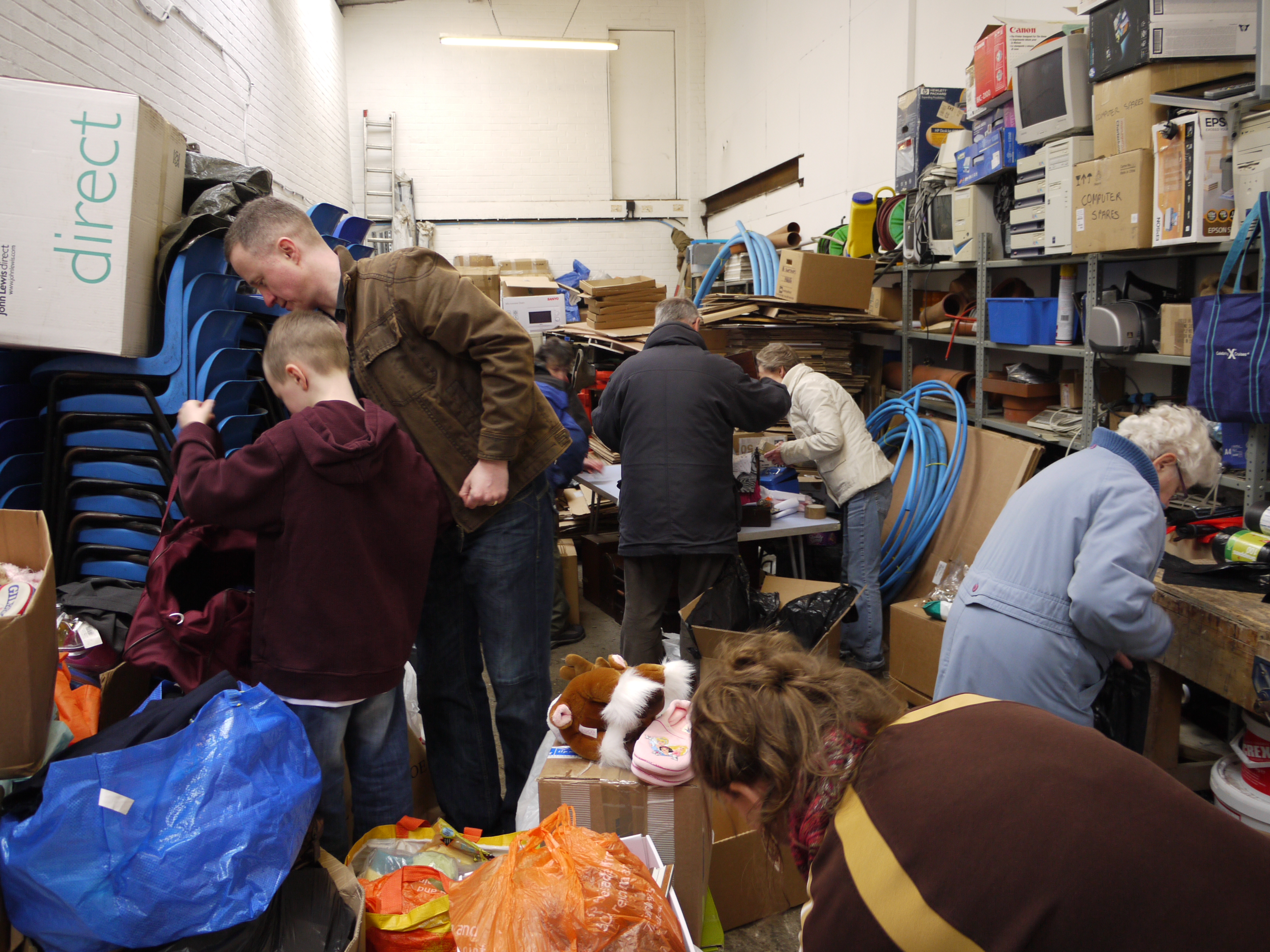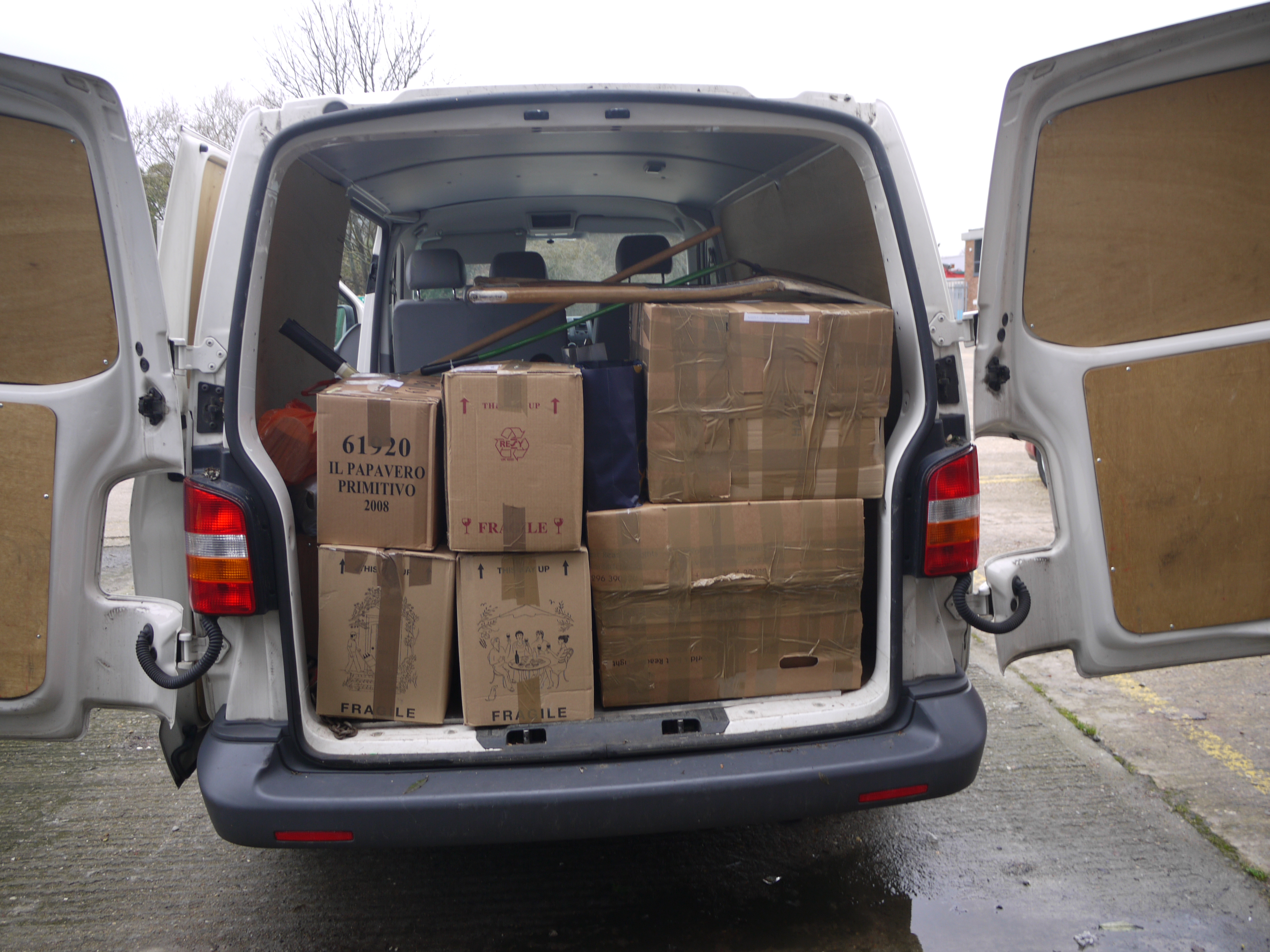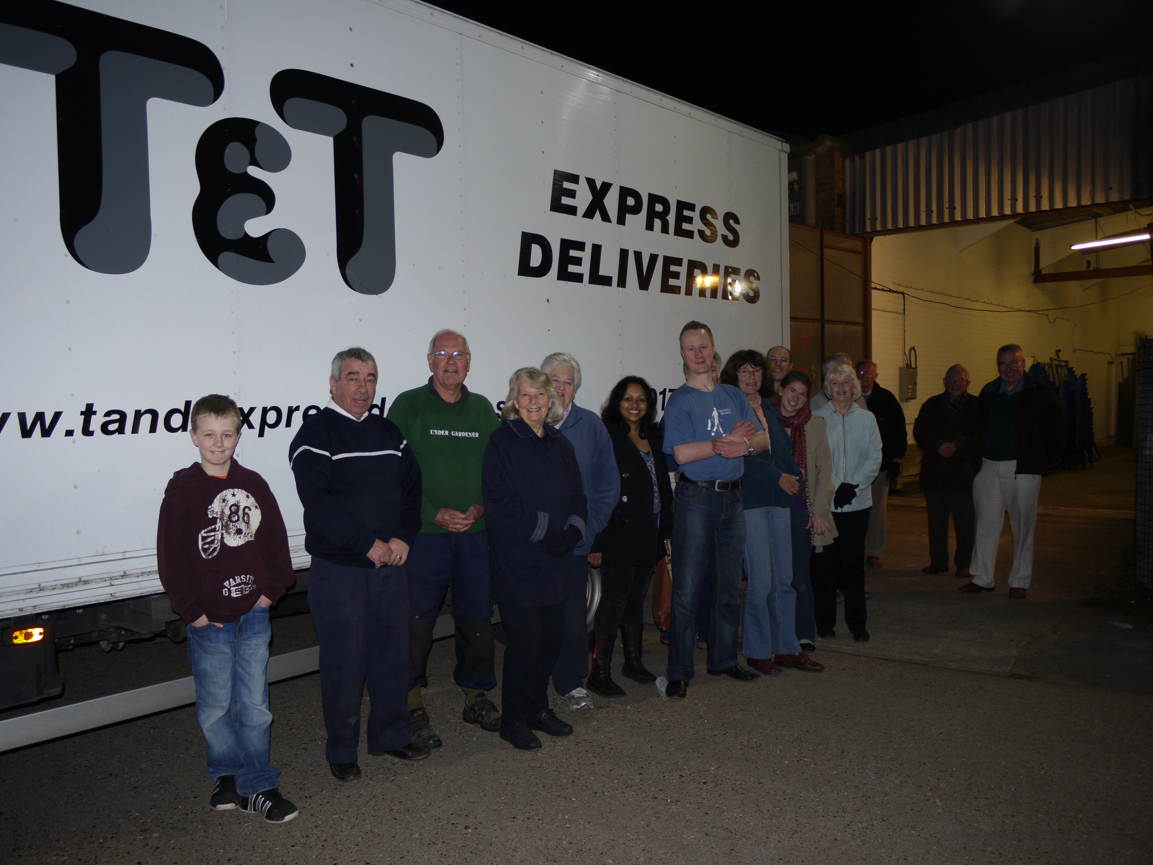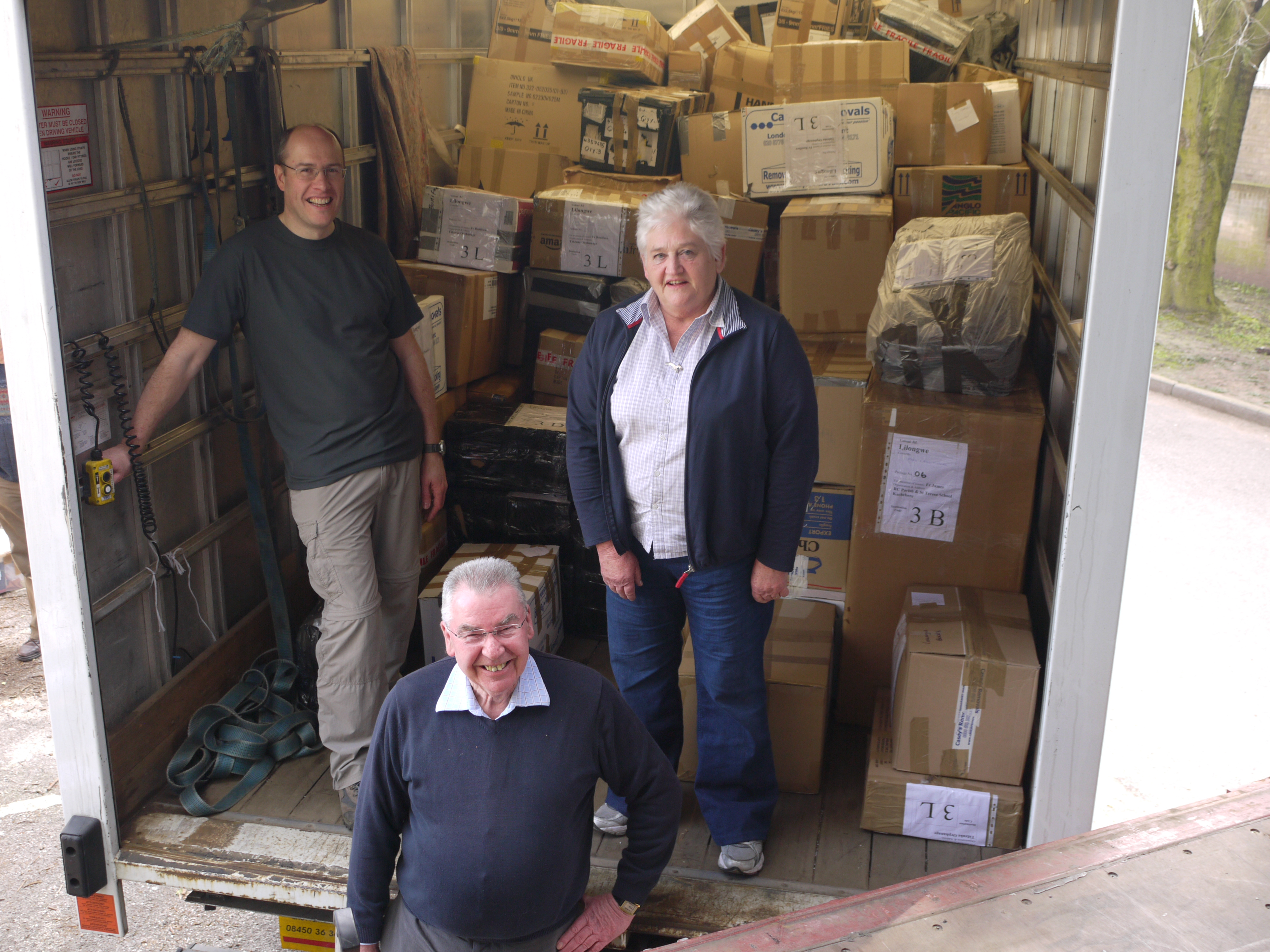 The whole process of gathering articles and packing them into cartons had been ongoing for four months. It culminated on Thursday March 24th, when over thirty of our parishioners arrived at the warehouse in Tonbridge, to help load. We were blessed–literally–with the presence of Fr Tom, who opened proceedings with prayers and gave a blessing to everyone and the consignment. He then took an active role in the loading process.